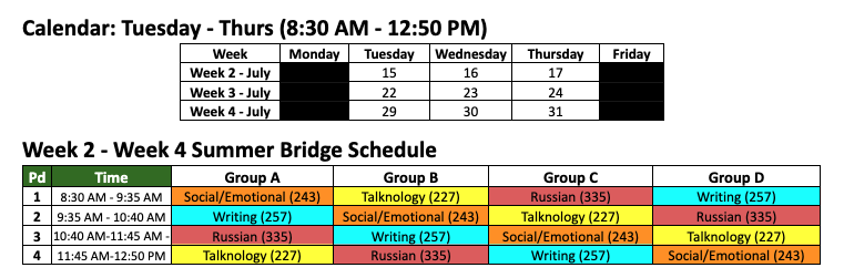 While this program is not mandatory, it is highly recommended that all students attend. The Summer Bridge Program will be an in-person program only.